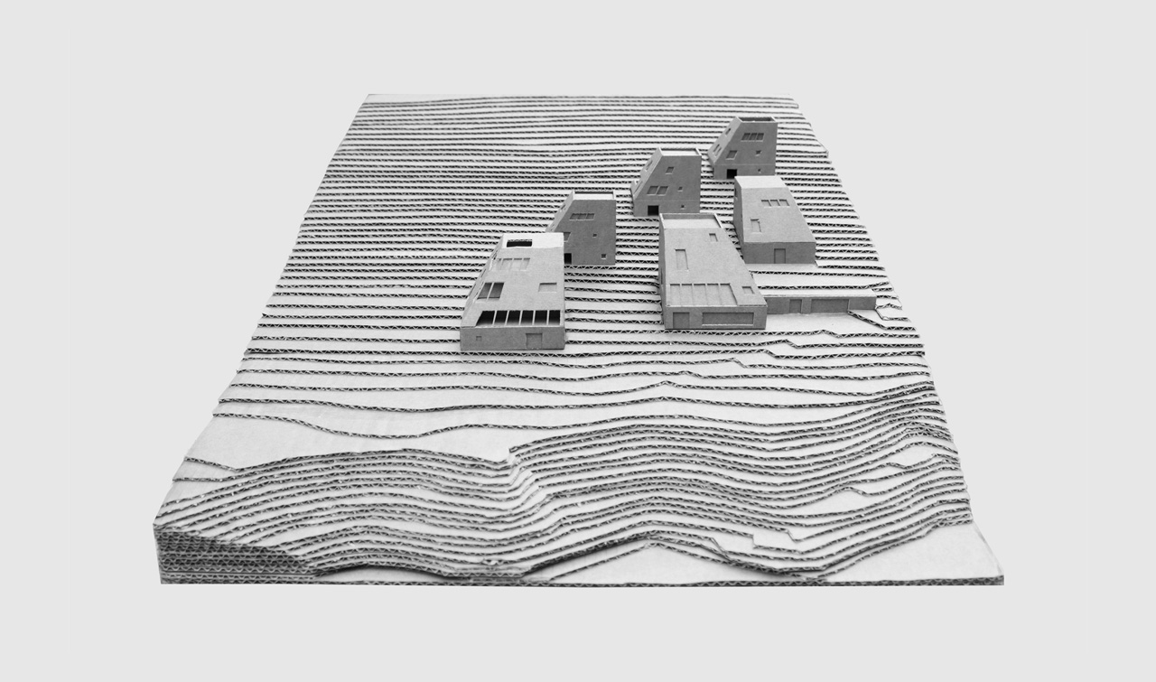 the project works with the landscape, interstices and layers of height. it is an interplay of heights and distances between the buildings. the six volumes are arranged to follow the natural slope of the terrain. multiple levels reflect the natural terraces typical of the valley’s landscape, where the buildings are. the paths connect the bodies and allow access to the sloping terrain.