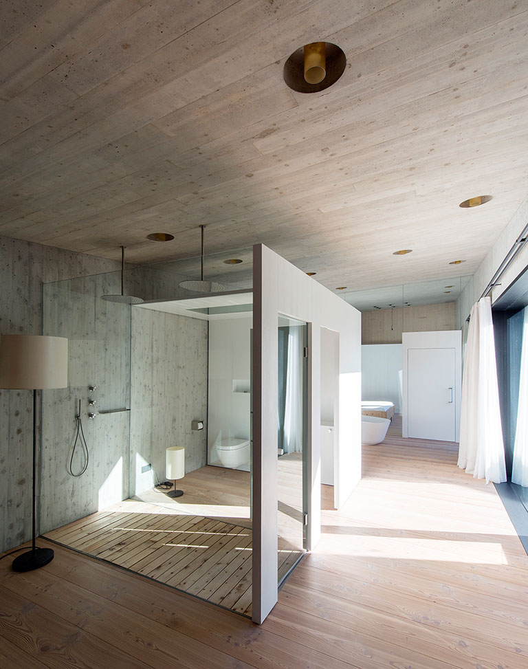 zeitlich und räumlich nur wenig entfernt von der hofstelle p erforscht das projekt, diesmal unter tektonischen gesichtspunkten, das verhältnis zum umfeld, das vom weinbau geprägt ist, mit seinem abschüssigem gelände und geordneten terrassierungen in einer kultivierten landschaft. ein monolithischer körper, der kraftvoll aus dem boden und seinen unebenheiten hervorwächst und der durch die verwendeten materialien, farben und geometrischen formen ein perfekt in die landschaft eingepasstes zeichen schafft. das neue gebäude befindet sich in der nähe des alten hofs der familie. im gegensatz zur linienführung der nahe gelegenen hofstelle p sind im köfererhof räume und formen in einem eindrucksvollen und gegliederten gebäude disponiert, das mit nachdruck den lebendigen und erfinderischen charakter seines eigentümers nachzeichnet und aufgreift – auch er ein bekannter winzer. der erste schritt bei dem projekt bestand darin, die aussenmauern in waschbeton auszuführen, dessen oberfläche sich im laufe der zeit in brillanz und farbigkeit verändert – eine art materielle und strukturelle hülle, in die ein in holz vorgefertigtes haus eingelassen wurde, das die statische funktion übernimmt. die innenräume entwickeln sich über verschiedene ebenen, so als griffen sie spielerisch über grosse und kleine, je nach erfordernis eingefügte öffnungen die formen der landschaft auf und folgten dem ständigen querverweis zwischen innen und aussen. ein knick in der lang gestreckten struktur lässt einen geschützten innenhof zu. dagegen führt eine breite treppe zur terrasse, von der aus man einen suggestiven blick in die landschaft hat.